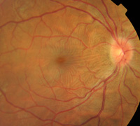 Figura 3. La compresión por una masa retroocular puede provocar pliegues retinianos debidos a la indentación del polo posterior. En este caso se acompañó de aumento de la hipermetropía del ojo afecto.