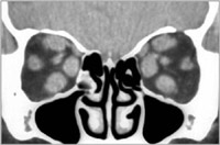 Figura 4. Oftalmopatía tiroidea: TC orbitario sin contraste. Reconstrucción en plano coronal en la que se aprecia un engrosamiento simétrico de los músculos rectos medial, superior e inferior, respetando los músculos rectos laterales.