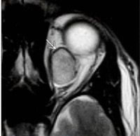 Figura 5. Hemangioma orbitario. RM secuencia T2SE axial. Masa intraconal de morfología ovoidea, bien definida. Muestra un halo hipointenso (flecha) que representa la pseudocápsula.