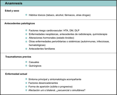 En aquest treball es discuteix l’estratègia per obtenir una anamnesis dirigida, i s’exposen les proves complementàries claus per fer diagnòstic de certesa. El diagnòstic radiològic té un paper rellevant en l’estudi d’aquestes malalties orbitàries.
