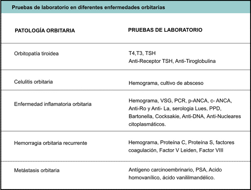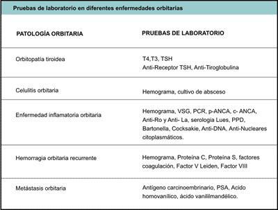 This paper discusses how to obtain a directed medical history, also identifies the ancillary tests to reach the diagnosis of certainty. The radiologic diagnostic tests play a very important role in the study of these orbital disorders.