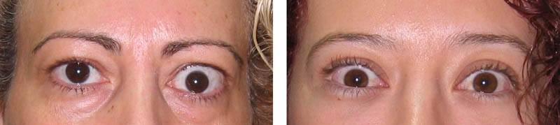 Figura 2a. Retracción de ambos párpados izquierdos y exoftalmos ipsilateral secundario a oftalmopatía asociada al tiroides. Figura 2b: Retracción ambos párpados superiores.
