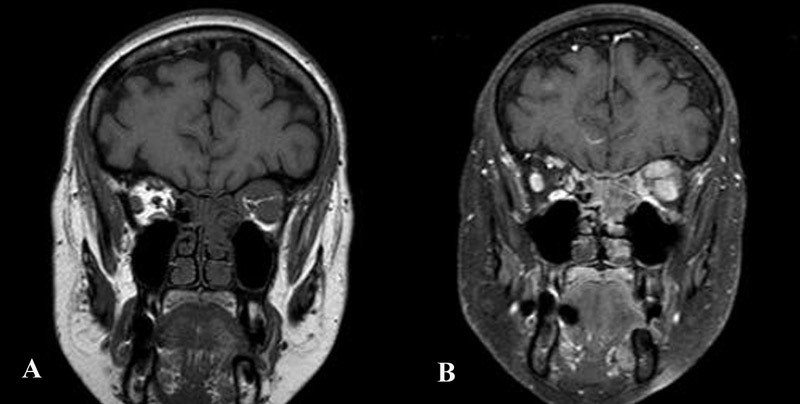 Figura 6. Metástasis tumor de mama. RM orbitaria en plano coronal. A) Secuencia T1SE en la que se aprecia un engrosamiento de la musculatura extrínseca ocular de la órbita izquierda. B) Secuencia T1SPIR post-gadolinio. La musculatura extrínseca afecta muestra un marcado realce tras la administración de contraste endovenoso.