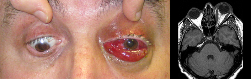 Figura 7. Fístula dural. A) imagen clínica con marcada congestión orbitaria, quémosis y limitación de los movimientos oculares. B) RM orbitaria en plano axial de fístula carótido-cavernosa izquierda. Secuencia T1SE en la que se aprecia un engrosamiento y ocupación del seno cavernoso izquierdo, con imágenes de vacío de señal en su interior (*). Asimismo se aprecia una estructura vascular patológica que se dirige a la órbita homolateral (<). Es evidente una marcada proptosis ocular y engrosamiento difuso de la musculatura extraocular del lado izquierdo.