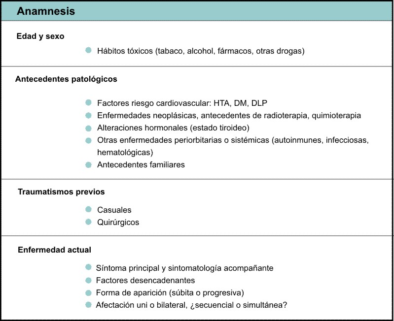 La naturaleza, la intensidad, la localización y la duración de dolor son detalles a obtener. Cuando es agudo, lancinante y acompañado de lagrimeo importante sugiere patología de superficie ocular. Por el contrario la patología inflamatoria orbitaria que cursa con congestión y aumento de la presión intraorbitaria se acompaña de dolor continuo de difícil manejo. Los factores desencadenantes del dolor pueden proporcionar información adicional en cuanto a la etiología. Por ejemplo, el dolor que se exacerba con las maniobras de Valsalva puede estar relacionado con patología venosa (varices orbitarias distendidas), si aumenta con el movimiento del globo ocular en una posición determinada sugiere miositis. Otros procesos no orbitarios (neuritis óptica o escleritis) también pueden reproducir este patrón.