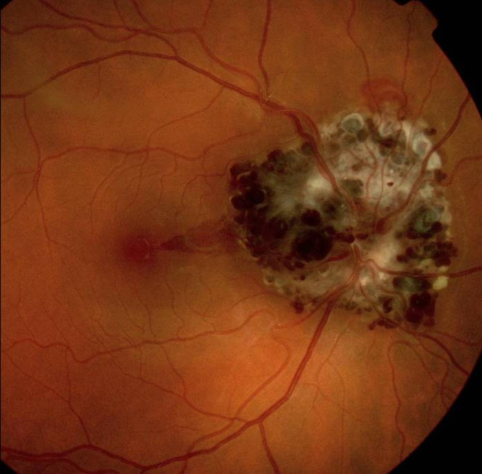 El hemangioma cavernoso es un tumor benigno de la retina formado por vasos retinianos dilatados, aneurismáticos y congestivos de aspecto cavernoso y paredes delgadas que se presenta como una masa retiniana de color rojo oscuro y superficie irregular con aspecto de un racimo de uvas, como el de la imagen presentada. En algunos casos puede producir hemorragias retinianas o hemovítreo, y puede asociarse a hemangioma del SNC y cutáneo. Estos tumores rara vez requieren tratamiento, y las técnicas más empleadas han sido fotocoagulación con láser argón, crioterapia, o incluso vitrectomía.