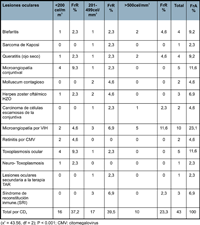 Las manifestaciones oculares de la infección por VIH pueden ser: vasculares, neoplásicas, infecciosas, inespecíficas y iatrogénicas. El espectro de las lesiones oftalmológicas así como su incidencia varían en las distintas partes del planeta, lo cual se justifica por la alta morbilidad y mortalidad entre este tipo de pacientes en los países en desarrollo fundamentalmente y de la aplicación de los diferentes esquemas de terapia antirretroviral. Las complicaciones oculares acontecen en un 70-80% de los pacientes que no siguen tratamiento antirretroviral y se encuentran en un estadio avanzado de la enfermedad. Entre el 5 al 25% de los casos diagnosticados con VIH pueden evolucionar a la ceguera en transcurso del desarrollo clínico de su enfermedad, en los países subdesarrollados según estadísticas publicadas. En el estudio la frecuencia de las lesiones oculares en los pacientes con VIH osciló en el 34,4%, con un predominio de CD