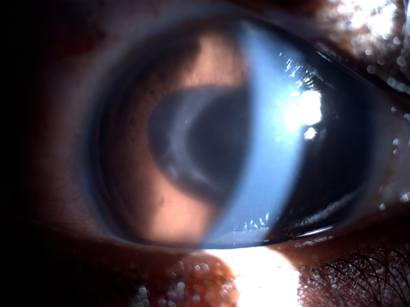 Figura 2. Niño de 9 años con uveítis crónica idiopática bilateral intervenido a los 7 años en otro país mediante facoemulsificación + implante de lente. Presenta queratopatía en banda, fibrosis preLIO, membrana ciclítica e hipotonía severa.