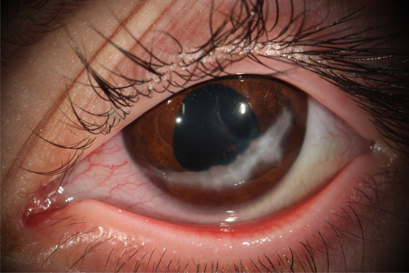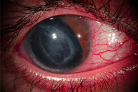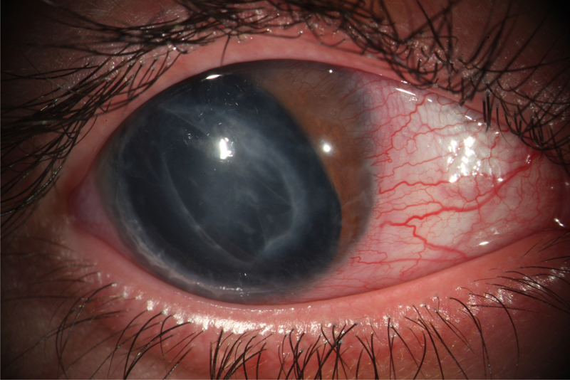 Figura 1. OD con cicatriz corneal, pérdida de iris y rotura de la membrana de Descemet.