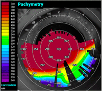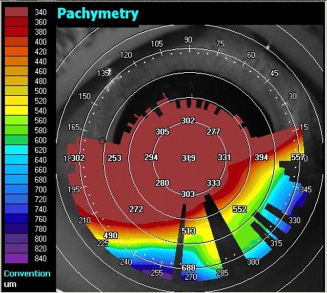 Del mismo modo se le hizo una paquimetría en la que se observó un adelgazamiento corneal de limbo a limbo con valores mínimos rondando las 250 micras de espesor (