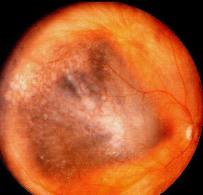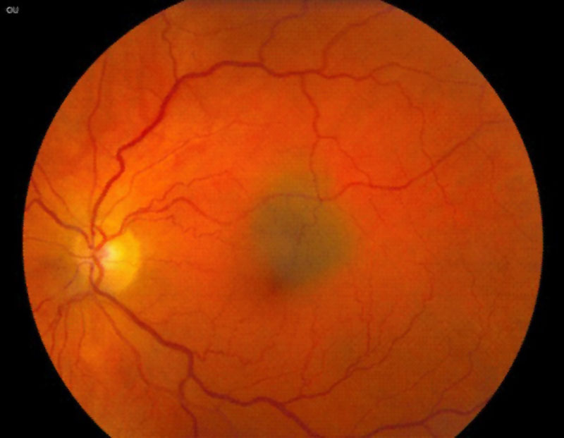 Figura 7. Nevus coroideo en zona macular. Cortesía del Wills Eye Hospital