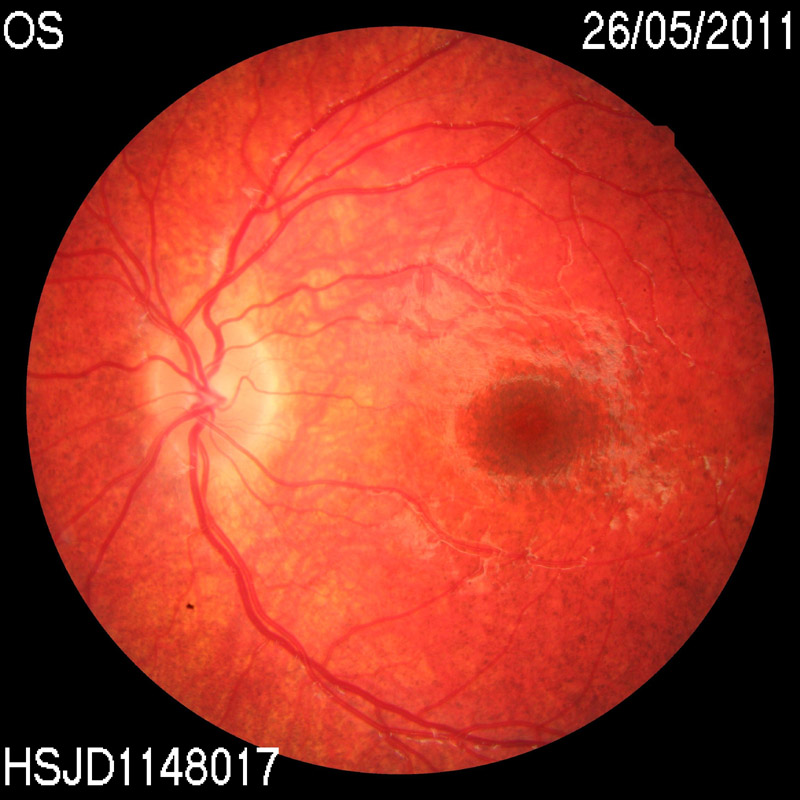 Durante los controles oftalmológicos el paciente tenía una agudeza visual de 0,8 en ojo derecho y 0,7 en ojo izquierdo sin corrección, test de Lang positivo, y en el fondo de ojo apreció una retinopatía en sal y pimienta periférica junto con un aumento de la pigmentación macular, con árbol vascular normal (Figura 1 y Figura 2). Se realizaron estudios con Electrorretinograma, Potenciales evocados visuales y Tomografía de coherencia óptica, resultando dentro de la normalidad.