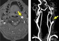 Figura 14. RM axial cervical T1 con supresión grasa (izda) que muestra disección carotídea izquierda y angioRM cervical con contraste (dcha) mostrando el característico afilamiento postbulbar de carótida interna izquierda. (flecha)