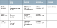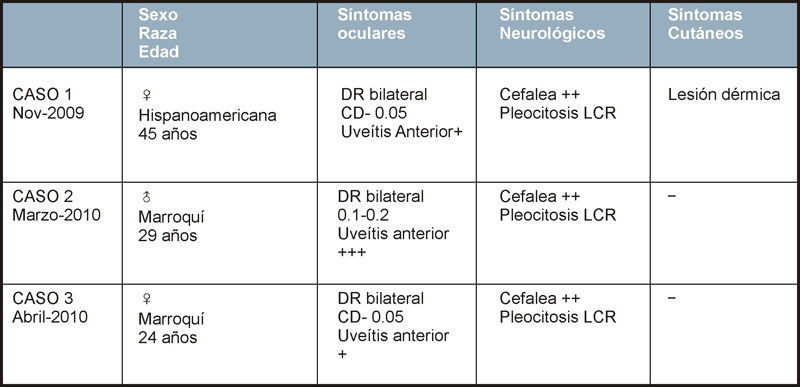 La enfermedad de Vogt-Koyanagi-Harada está descrita como una panuveítis granulomatosa bilateral asociada a manifestaciones neurológicas y dermatológicas de aparición infrecuente en áreas geográficas como la nuestra. No obstante, presentamos 3 casos de pacientes diagnosticados en nuestro hospital en un periodo de 6 meses (Noviembre - Abril). El síntoma principal en los 3 casos fue la disminución severa de la agudeza visual (AV), motivada por desprendimiento de retina (DR) bilateral, y cefalea. Otros síntomas estaban presentes en diferente grado.