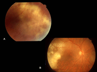 Figura 2. A. Lesiones retinianas de aspecto necrótico con células en el vítreo en un paciente con linfoma primario retiniano. B. Lesiones subretinianas en un paciente con linfoma primario retiniano.