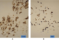 Figura 4. Aspirado vítreo. Tinción de CD20+ (A) y Ki67 (B) en un paciente con linfoma retiniano B con alto grado de proliferación.