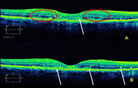 Figura 6. Tomografía de coherencia óptica. Se observa infiltración del EPR y membrana de Bruch en un paciente con linfoma retiniano A y B.