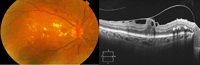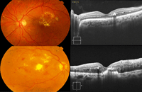 Figura 7. Exudados duros circinados alrededor de un microaneurisma. Exudados duros subfoveales con engrosamiento de la retina de componente espongiforme.