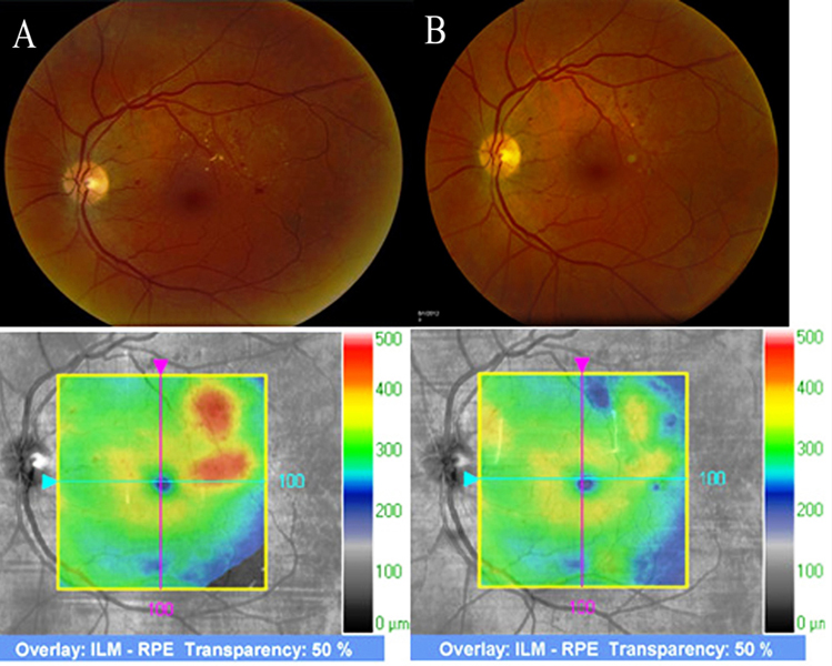 Figura 9. (A) En la retinografía se aprecian microaneurismas y exudados duros maculares, asociados a un engrosamiento retiniano en el mapa topográfico. (B) Después de un año tras el tratamiento con fotocoagulación focal, se aprecian los impactos de láser pigmentados, con resolución completa del edema y desaparición de la exudación lipídica.