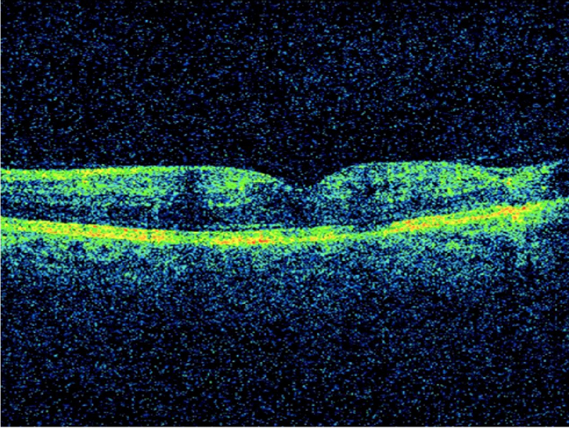 Figura 2. Resolución de la hemorragia foveal de la Figura 1. La reabsorción de la hemorragia y del edema macular dan paso a una normalización del contorno foveal, con atrofia de las capas externas.