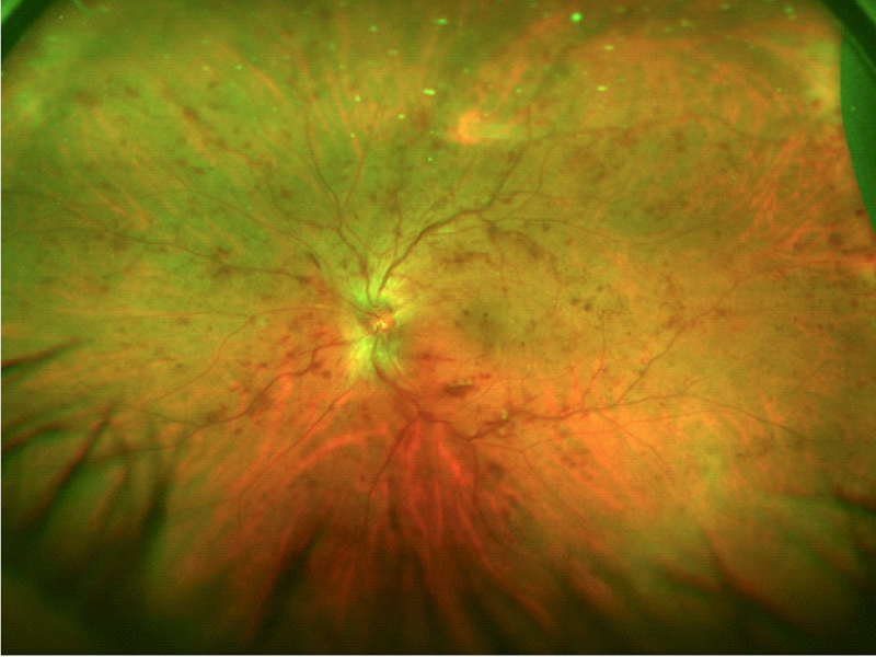 Figura 4. Angiografía de la paciente anterior en la que se aprecia el cierre vascular en la retina periférica temporal.