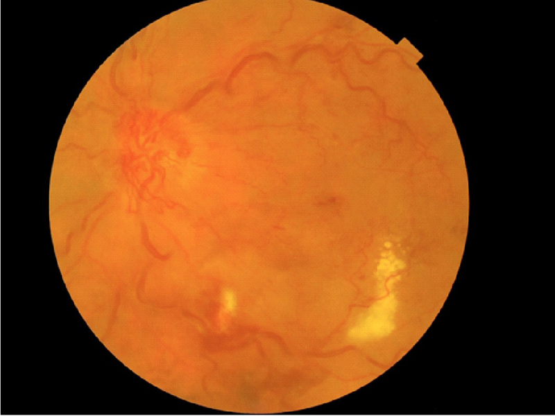 Figura 10. Oclusión de la vena central de la retina después de 1 año de evolución: importante tortuosidad vascular, colaterales papilares, edema macular y exudación lipídica crónica.