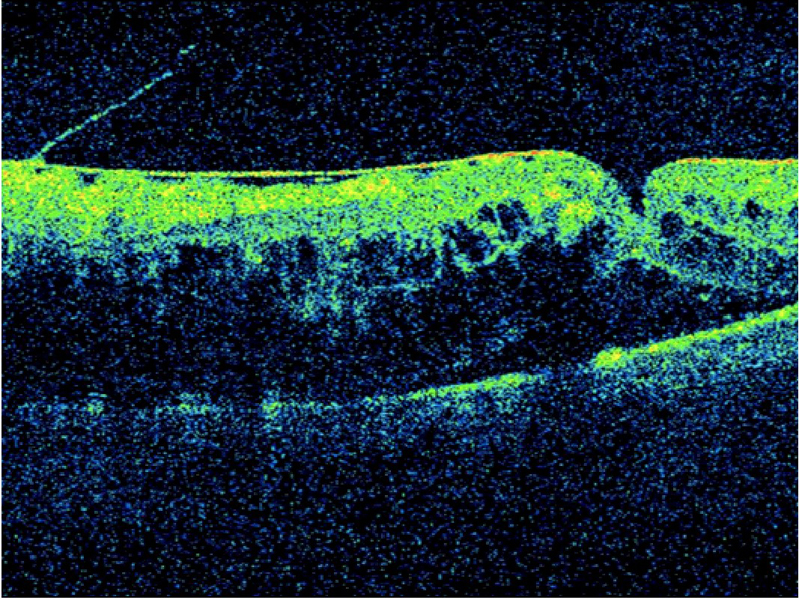 Figura 11. OCT del paciente de la Figura 10: gran engrosamiento retiniano con quistes intraretinianos y desprendimiento seroso retiniano. En la parte izquierda de la imagen se ven tanto la hialoides como una membrana epirretiniana.