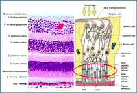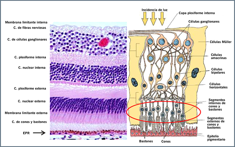 Figura 1. Anatomía de la retina (corte histológico e ilustración esquemática).