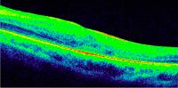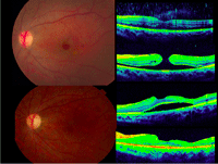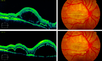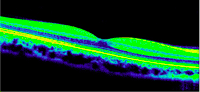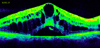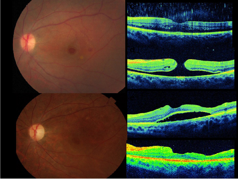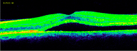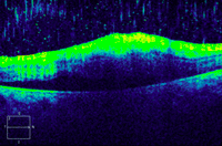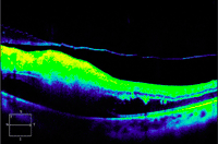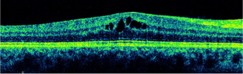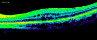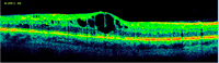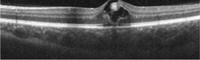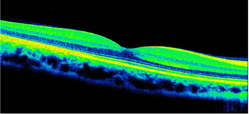 Figura 7. Desprendimiento de retina seroso subfoveal asociado a edema macular quístico en una paciente con coroidopatía tipo Birdshot.
