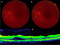 Figura 11. Paciente con uveítis asociada a enfermedad de Behçet (a, retinografía de campo amplio; b, angiografía fluoresceínica de campo amplio) que presentaba edema macular quístico de larga evolución (c), que al resolverse dejó atrofia foveal grave (d).