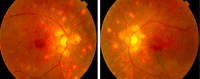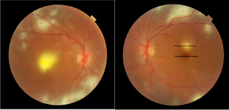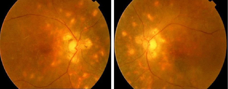 Figura 27. Paciente de 25 años que consulta por disminución de AV en ambos ojos (AO). En la exploración la AV es de 0,05 en AO y en el fondo de ojo hay focos de retinitis en polo posterior en AO.