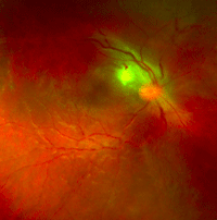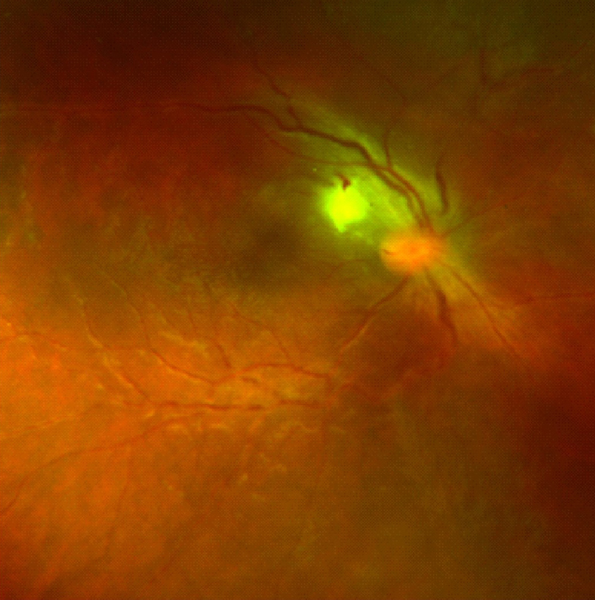 Figura 24. Paciente que presenta en su ojo derecho un foco de coriorretinitis peripapilar secundario toxoplasmosis.