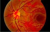 Figura 29. Paciente de 17 años que consulta por presentar un escotoma central en su ojo izquierdo. En el examen del fondo de ojo de observa un engrosamiento y una imagen amarillenta central.