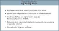 Otros hallazgos característicos de actividad son el engrosamiento y el desprendimiento de la hialoides posterior adyacente a la lesión y el aumento de la reflectividad de las capas internas de la retina con ensombrecimiento del EPR y la coriocapilar subyacente