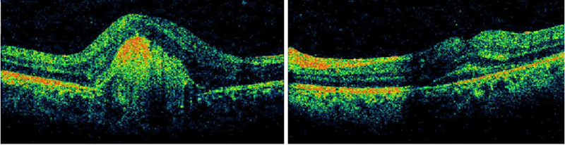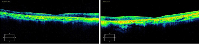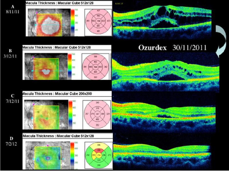 Figura 3. Paciente que presenta en su ojo izquierdo edema macular quístico y desprendimiento de retina seroso subfoveal asociado a uveítis posterior por Brucella. Mediante la OCT se monitoriza la respuesta al tratamiento con un implante intravítreo de Ozurdex, observándose como disminuye el grosor retiniano a medida que se reabsorbe el fluido y se normaliza el perfil foveal tras el tratamiento.