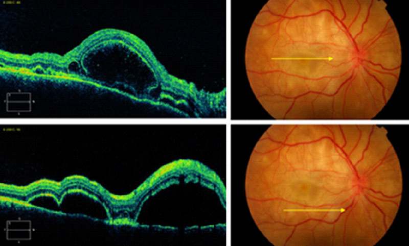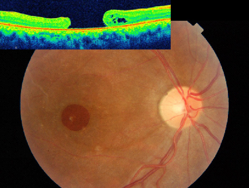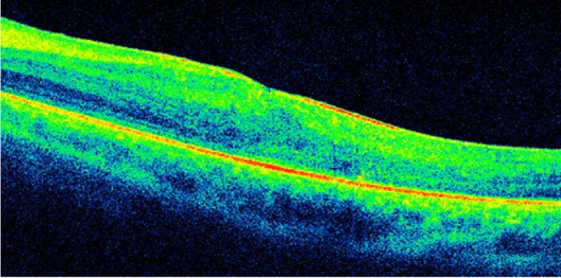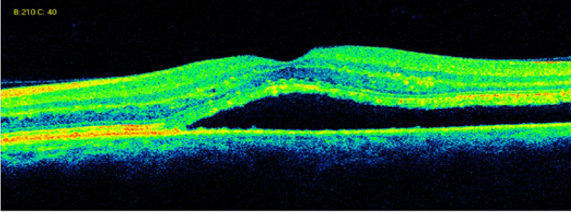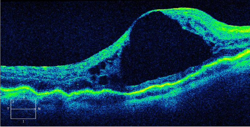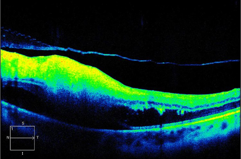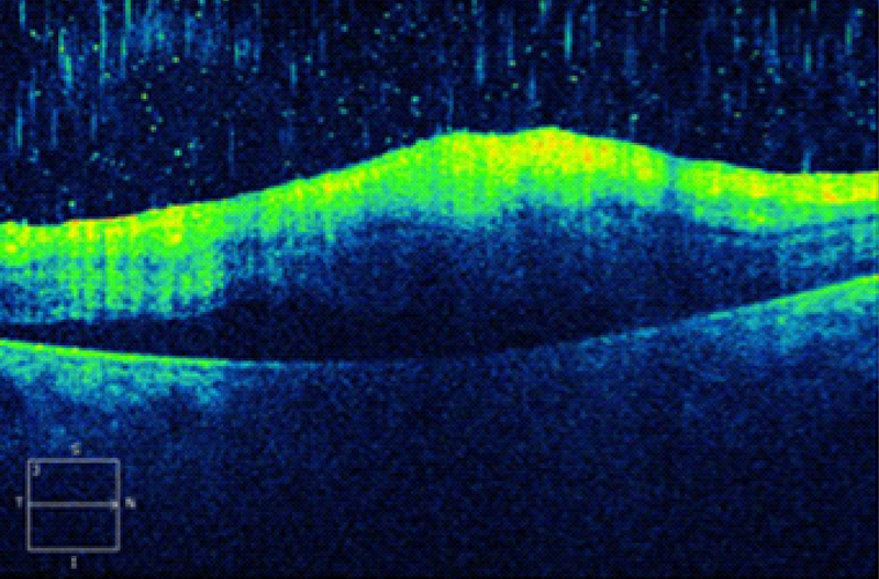 Figura 6. Desprendimiento de retina seroso (DRS) en una paciente con uveítis asociada a enfermedad de Behçet.