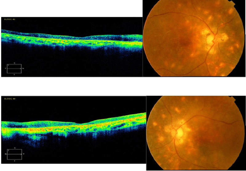 Figura 10. Atrofia foveal bilateral en paciente con coroidopatía tipo Birdshot en estadio avanzado.