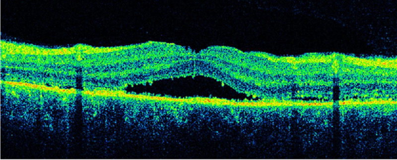 Figura 17. Agujero macular de espesor completo y gran diámetro secundario a enfermedad de Behçet.
