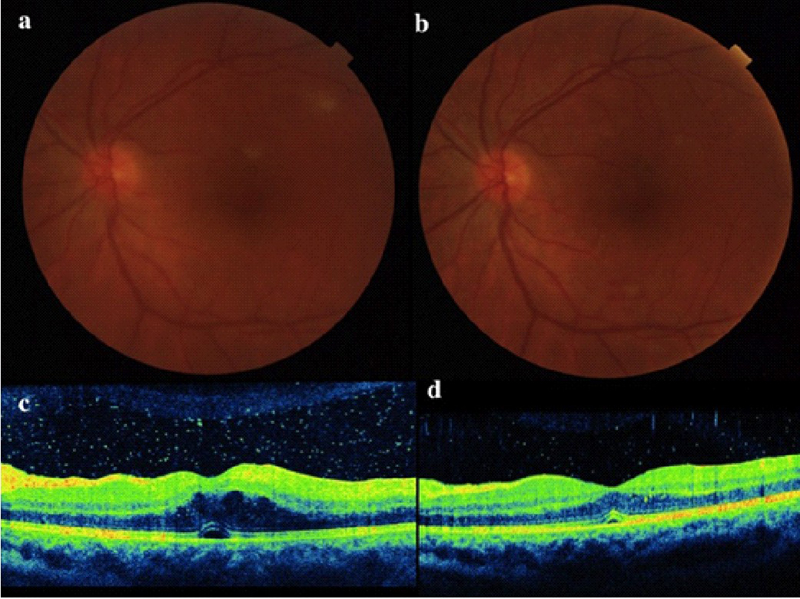 Figura 18. Focos de retinitis y vitritis en paciente con uveítis asociada a enfermedad de Behçet (a) en el que su OCT muestra celularidad vítrea y edema macular (c). Los focos de retinitis y la opacidad vítrea desaparecen con el tratamiento con infliximab (b) y la OCT se normaliza (d).