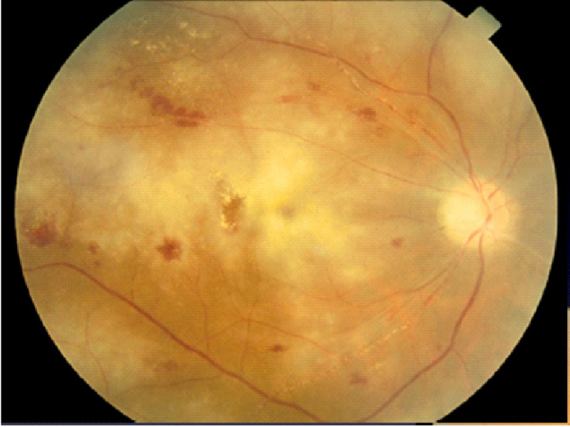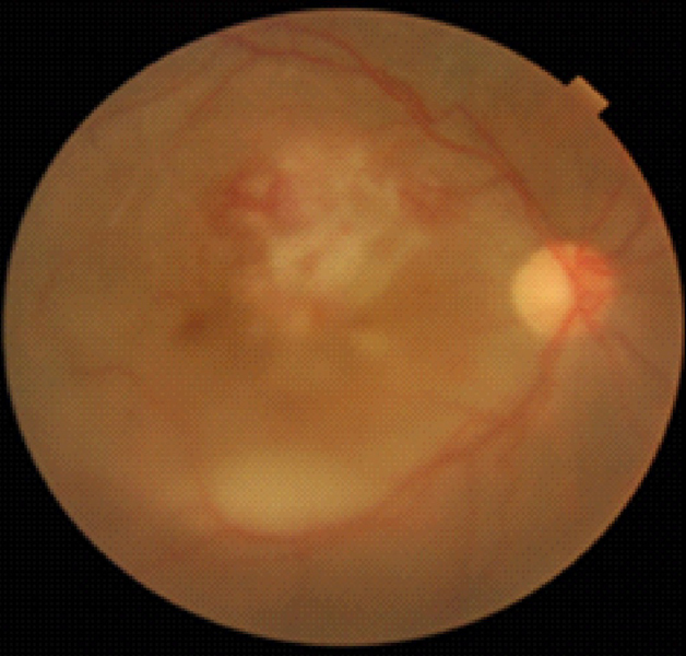 Figura 26. Retinitis por CMV en paciente con trasplante renal en tratamiento inmunosupresor.