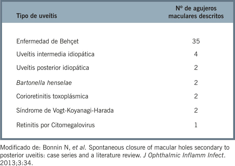 17 describe el agujero macular como una complicación rara de las uveítis, siendo más frecuente el agujero macular idiopático o senil, postoperatorio o secundario a tracción vítreo-macular o membrana epiretiniana, pero infrecuente en la inflamación de segmento posterior.