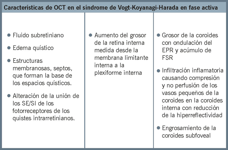 Otra forma de presentación es la epiteliopatía placoide multifocal posterior aguda, que en la OCT se observa como infiltrados coroides difusos que son complejos hiperreflectivos y áreas de engrosamiento del EPR/coriocapilar. Otro hallazgo de la OCT es la reducción en el tamaño y el número de vasos coroideos, y la disrupción de los segmentos internos y externos