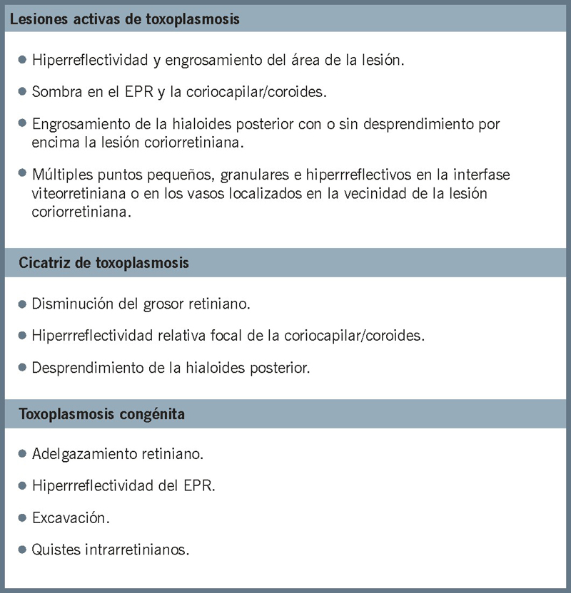 Se han identificado, mediante las imágenes de OCT, características que diferencian entre lesiones activas e inactivas por toxoplasmosis. Las lesiones activas se caracterizan por ser áreas intraretinianas hiperreflectivas correspondientes a focos de retinitis.