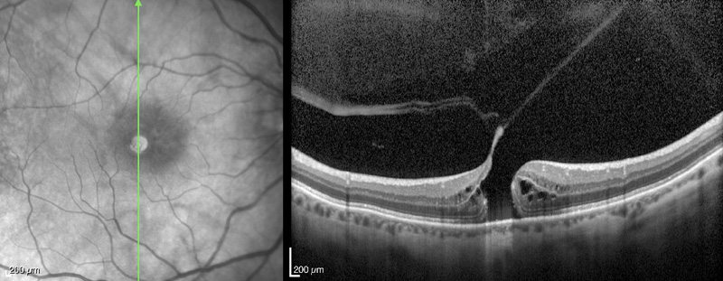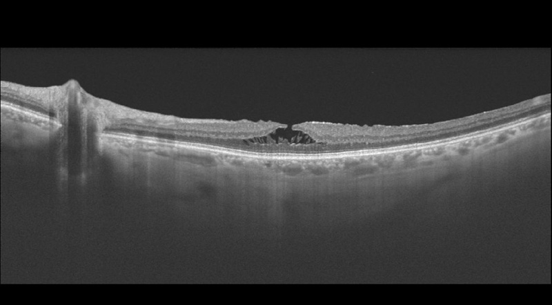 Figura 31. Agujero macular miópico, con tracción y esquisis macular, al mes de realizar cirugía de vitrectomía.