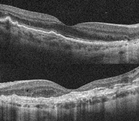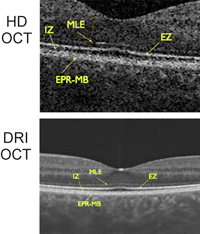 Figura 1 puede verse una OCT macular realizada con HD- OCT (Cirrus de Zeiss) aumentada, y en la imagen inferior realizada con OCT de última generación DRI-OCT (Atlantis de Topcon).
