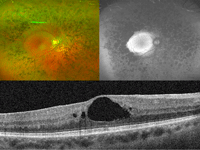 Figura 8. Distrofia viteliforme, foveomacular o pseudoviteliforme del adulto. Retinografía (imagen superior izquierda), autofluorescencia macular (imagen superior derecha) y OCT (imagen inferior) del ojo derecho de la hermana, de 86 años de edad, del paciente de las Figuras 6 y 7. En la autofluorescencia la lesión viteliforme se pone de manifiesto como una zona redondeada de hiperautofluorescencia en el centro de la mácula.