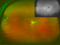 Figura 11. Paciente con retinosis pigmentaria. Retinografías (imágenes superiores) y autofluorescencia (imágenes inferiores) de campo amplio con Optomap.