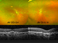 Figura 49: retinografía y OCT, superior) con una MAVC de 0,6, frente al ojo izquierdo con MAVC de 0,9.