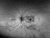 Figura 42. Distrofia viteliforme del adulto. En el mismo paciente, con autofluorescencia de campo amplio se observa que las alteraciones no son sólo foveales, sino que muestra un patrón reticular en ambas arcadas superiores y la zona temporal macular. En ocasiones, estas alteraciones pueden pasar desapercibidas en la exploración del fondo de ojo.