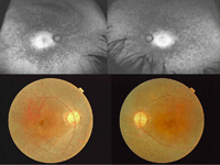 Figura 46. Varón de 32 años de edad, originario de Pakistán, con retinosis pigmentaria asociada a MER bilateral y CSC en el ojo izquierdo. Imágenes superiores, autofluorescencia; imágenes inferiores, retinografías.